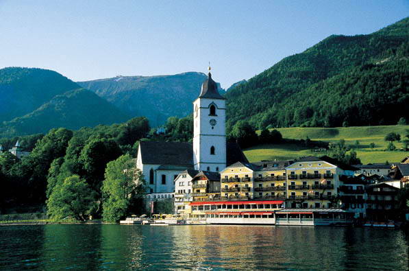 На фоне живописных альпийских склонов, у сверкающей глади озера Wolfgang с кристально чистой и теплой водой, расположено старинное здание с нарядным фасадом и остроконечной башней — знаменитый Romantikhotel Im Weissen Roessl.