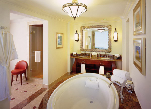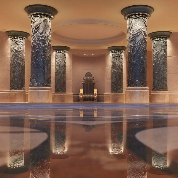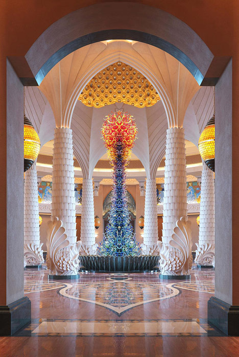 Главный холл, названный The Royal Towers, поражает: смешение воды, камня, золота, живописных полотен на античные сюжеты и арабских узоров... В центре холла на глади небольшого бассейна, обрамленного стекающими по бортику струйками воды, возвышается 10-метровая стеклянная скульптура из цветного дутого стекла, созданная дизайнером Дэйла Чихули и составленная из более чем трех тысяч фрагментов.