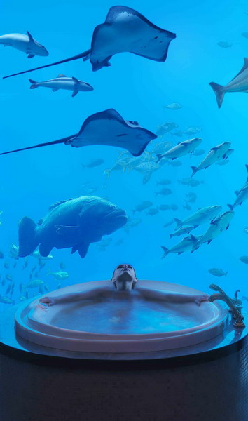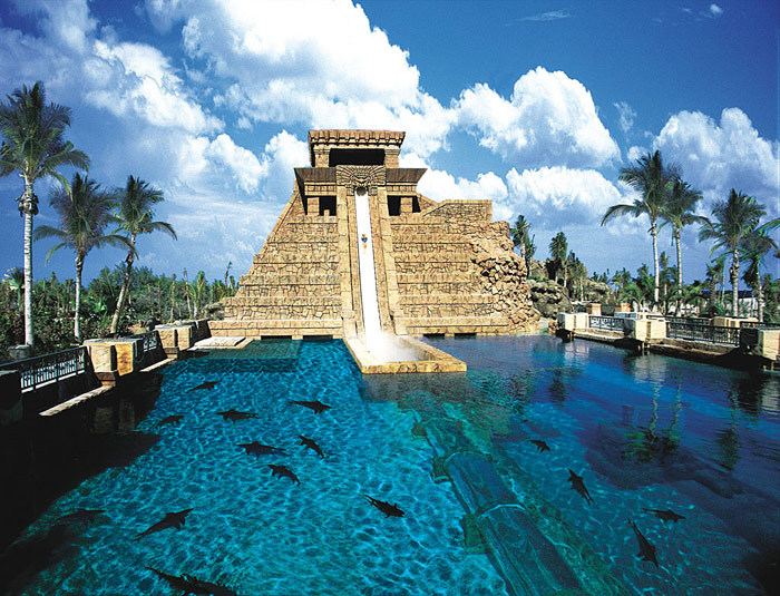 Стоит лишь пройти немного по коридору, и из золотого, декорированного в восточном стиле холла с кофейней попадаешь в затопленную Атлантиду - спускаешься в большую подводную лагуну, где среди руин плавают огромные скаты, акулы, пираньи - всего 65 тысяч морских обитателей. За этим гигантским аквариумом с искусственно созданной морской экосистемой ежедневно ухаживают 165 специалистов - биологов, авариумистов, ветеринаров.