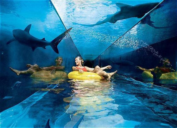 Следующая горка - The Serpent (змейка). Чтобы прокатиться на этом аттракционе, нужно подняться вверх на башню Ziggurat на 13 метров. Оттуда предстоит быстрый спуск по спирали в самый центр башни, за которым последует путешествие через бассейн с акулами, причем на очень медленной скорости.