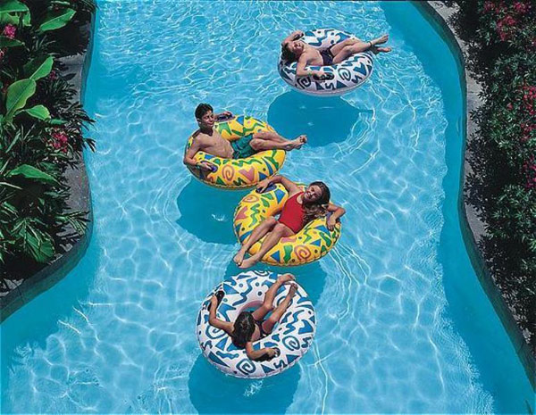 Водные аттракционы включают довольно продолжительный по времени сплав (протяженность всего маршрута – 2 км) по реке с водопадами, приливными волнами и порогами. Отсюда открывается прекрасный тропический пейзаж. Эта часть аттракциона называется The Current - поток, который проходит по кругу и приводит к башне Ziggurat, построенной в стиле строений Месопотамии и величественно возвышающейся на 30 метров. В этой башне находится 7 водных горок, две из которых проходят через бассейн с акулами.