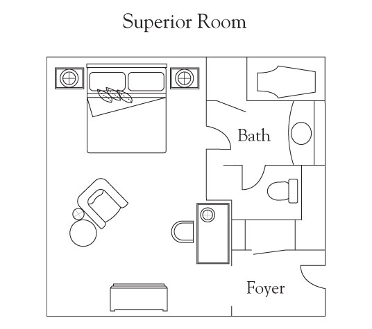 Superior Guestroom - общая площадь - 40кв.м. Из окон открывается вид на внутренний двор отеля. Номер состоит из спальни, ванной комнаты и небольшой прихожей. Номера этой категории расположены на этажах с третьего по двенадцатый. Постельное белье, халаты и покрывала от знаменитой фирмы Frette