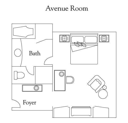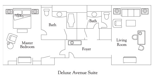 Deluxe Guestroom - общая площадь - 40 кв.м. Из окон номеров открывается вид на внутренний двор. Номер состоит из спальни, ванной комнаты и небольшой прихожей. Данная категория номеров расположена с четырнадцатого по двадцать второй этаж. Avenue room - площадь 40 кв.м. Из окон открывается вид на Шестую авеню. Номер состоит из спальни, ванной комнаты и небольшой прихожей. Постельное белье, халаты и покрывала от знаменитой фирмы Frette