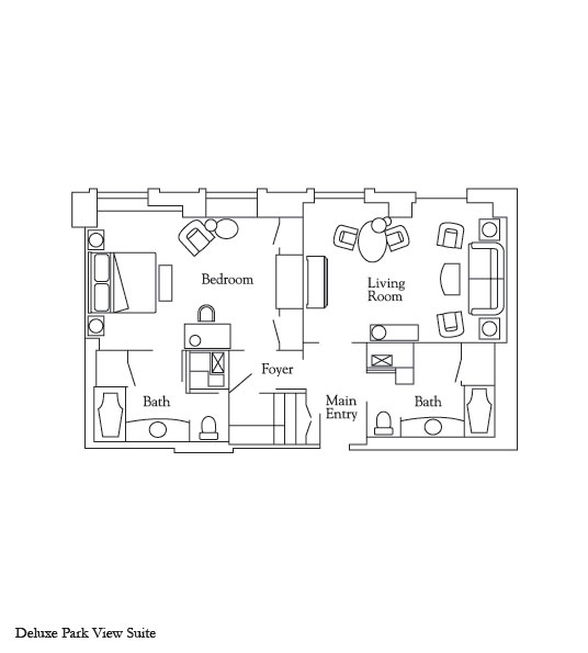 Deluxe Park View Suite - общая площадь - 91кв.м. Номер состоит из спальни, гостиной, двух ванных комнат и прихожей. Из окон открывается вид на Центральный парк. Номер оборудован телескопом, 32-дюймовым телевизор LG с плоским экраном, миниатюрной гардеробной. Проживающие в данной категории могут пользоваться услугами консьерж клуба - Club Lounge