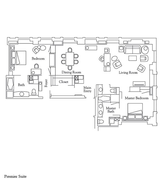 Premiere Suite - общая площадь - 114кв.м. Номер состоит из спальни, просторной гостиной с плазменной панелью, столовой зоны максимум на 6 мест, ванной комнаты, небольшой прихожей. Возможно присоединение второй ванной комнаты (по запросу). Из окон открываются виды на Центральный Парк. Также, к услугам гостей: библиотека, в которую вошли книги по искусству и архитектуре Нью-Йорка, стереосистема Bang & Olufsen, коллекция дисков, CD-плейер, многоканальный беспроводной телефон, гардеробная. Проживающие в данной категории могут пользоваться услугами консьерж клуба - Club Lounge