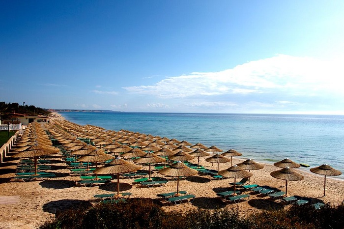 на п-ове Кассандра, и в 1 км от исторического канала Потиды, в 5 км от посёлка Неа Муданья, в 55 км от аэропорта г. Салоники.