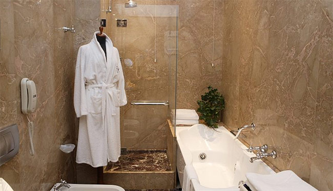 Номера с видом на сад, внутренний двор или город. Состоят из спальни с креслом, ванной комнаты, отделанной мрамором с мозаикой и майоликой.