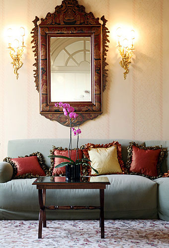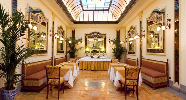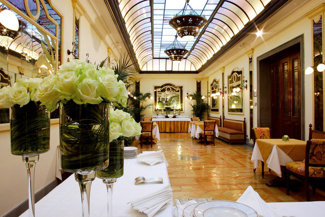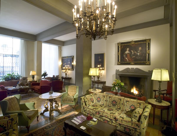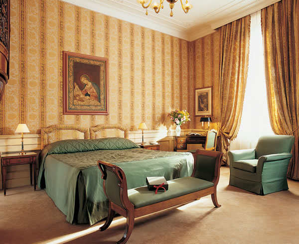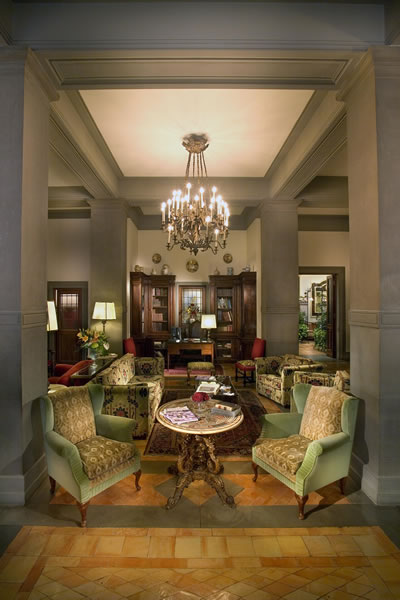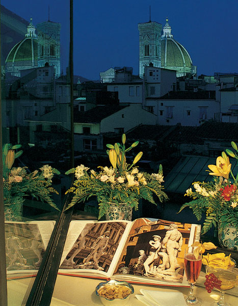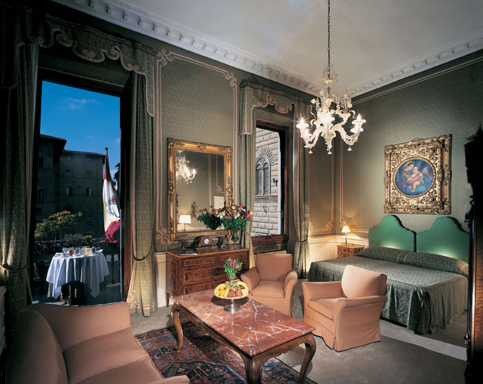 В номерах – элегантные индивидуальные интерьеры, воссоздающие атмосферу старинной Флоренции: терракотовые полы, ниши и высокие потолки с лепниной, мерцающие хрусталем люстры, антикварная мебель, зеркала в золоченых витых рамах, мозаичные инкрустации, подлинные живописные полотна, из высоких окон, украшенных красиво драпированными шторами из парчи и шелка, открывается великолепный вид на средневековую флорентийскую архитектуру и купола Дуомского собора.