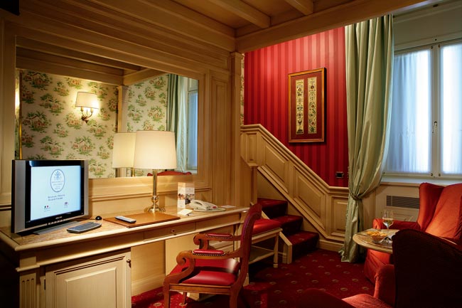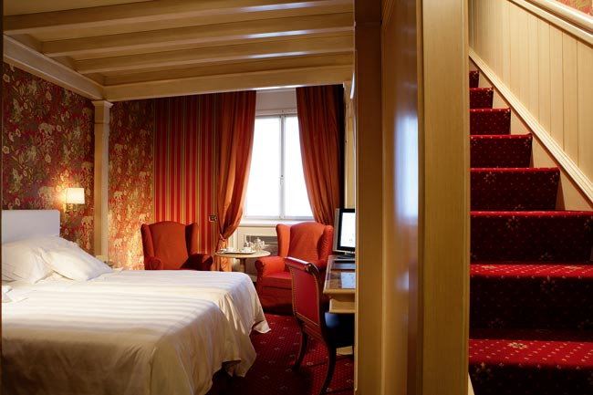 Double De Luxe Room - каждый номер этой категории отличается от другого, все они элегантно меблированы в духе неоклассического стиля, с богатым художественным оформлением и деталями, способными пробуждать радостные эмоции. Это самые большие комнаты, в некоторых номерах есть балконы с видом на сад. Полы из твердых пород дерева и настилка шерстяных ковров, богатые и изящные ткани, покрывающие кресла, стены и окна. Все ванные полностью отделаны мрамором и оборудованы системой гидромассажа или душем. Можно попросить одну «Королевскую» или две отдельных одинаковых кровати, оба варианта снабжены эксклюзивной системой "СЛАДКИЕ СНЫ"