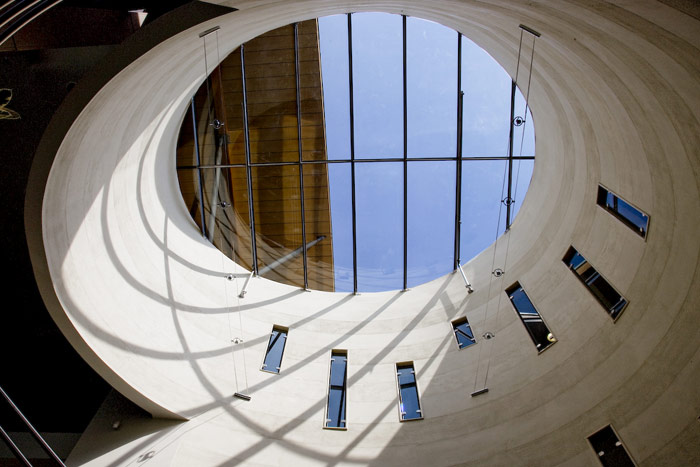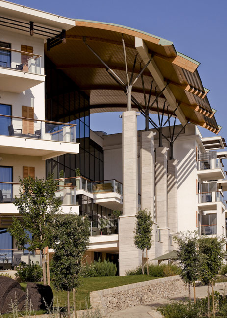 Отель Monte Mulini частично освещается естественным светом, в дизайне использовано много стекла. Изогнутая крыша отеля расположена таким образом, чтобы летом стеклянная стена оставалась в тени, защищая гостей от жары.