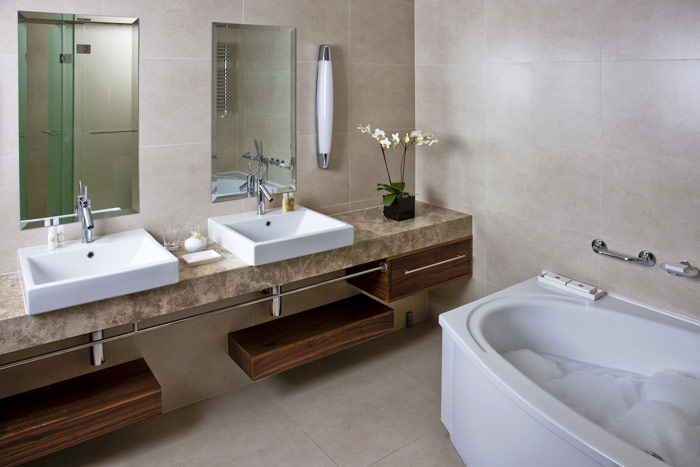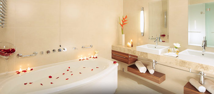 Ванные комнаты просторны- с интерьером, сделанным из таких натуральных материалов как камень и дерево, что является великолепным окружением для расслабления в шикарной ванне или душевой кабинке с эффектом тропического дождя. Эти уютные Spa-оазисы с обогреваемым мраморным полом предлагают наилучшие косметические средства, две раковины, телефонную линию и имеют прямой доступ к гардеробу.
