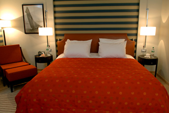 Интерьеры номеров, созданные по проектам всемирно известного итальянского дизайнера Лоренцо Беллини, оформлены в теплых тонах, перекликающихся с красотами окружающих пейзажей. Дизайнерская мебель, яркие ткани, абстрактные полотна, небольшие детали, подчеркивающие простоту и уют номера, широкие окна во всю стену – каждый элемент этой гармоничной композиции органично вписан в общую строгую концепцию, неотъемлемо связанную с видами на роскошный парк, таинственные очертания островов и серебристую гладь залива.