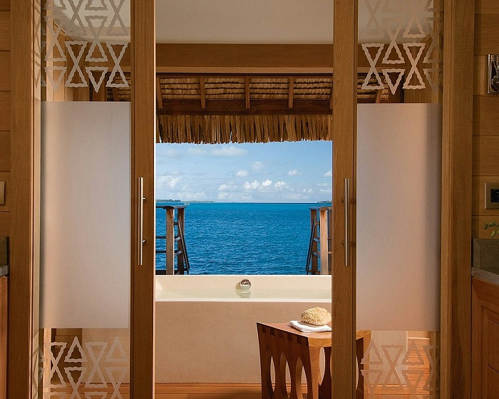 Beach-View Over-Water Bungalow (100 кв. м) – состоит из спальни с кроватью king-size или двумя кроватями queen bed, гостиной, ванной комнаты, террасы с шезлонгами, обеденным столом и спуском в лагуну. Вид на пляж. Расположены на сваях над водой. Макс. размещение – 3 взрослых или 2 взрослых и 2 ребенка.