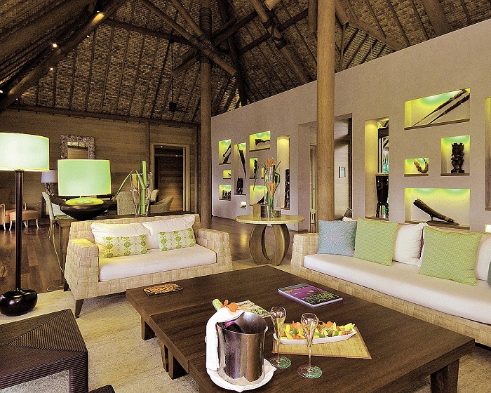 Resort View Over-Water Bungalow (100 кв. м) - состоит из спальни с кроватью king-size, гостиной, ванной комнаты, террасы с шезлонгами, обеденным столом, и спуском в лагуну. Расположены на сваях над водой. Вид на территорию курорта. Макс. размещение – 3 взрослых или 2 взрослых и 2 ребенка.