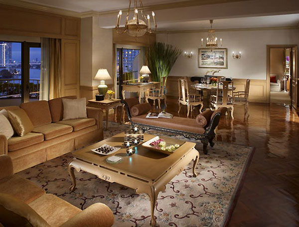Krungthep Deluxe Suite (84 кв. м) -выполнен в классическом тайском стиле с элементами современного европейского дизайна. Состоит из спальни, гостиной, ванной комнаты, отделанной мрамором, ванной и душем, балкона с видом на реку, сад и бассейн