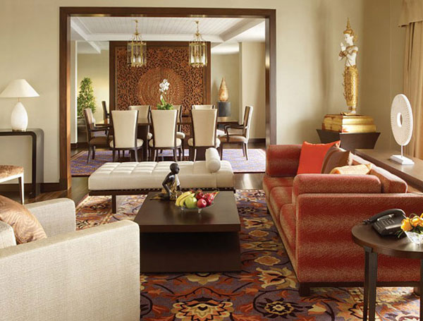 Presidential Suite (306 кв. м) - роскошный номер, выполненный в классическом тайском стиле, включает спальню, гостиную, обеденную зону, мини-кухню, ванную комнату, отделанную мрамором, с джакузи и душевой кабиной