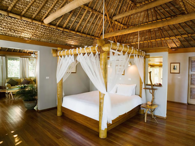 Бунгало с соломенной крышей и огромными окнами, из которых открывается чудесный вид на Голубую лагуну, расположено у кромки пляжа. Номер состоит из спальни, гардеробной, гостиной зоны, открытой веранды с шезлонгами и душевой зоны, выложенной кафелем.