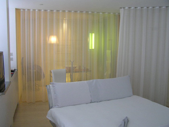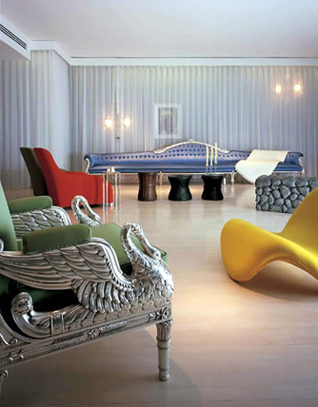 Комфортабельные номера отличаются утонченностью и оригинальностью дизайна, сочетающего стиль барокко и авангард — стены заменены стеклянными перегородками, скрывающимися под драпировкой занавесок из невесомой полупрозрачной ткани нежных оттенков, изящная мебель украшена художественной резьбой, на полу — ковры с ручной росписью, изображающей шедевры мастеров эпохи Возрождения, а умиротворяющие пейзажи расположены на потолке.