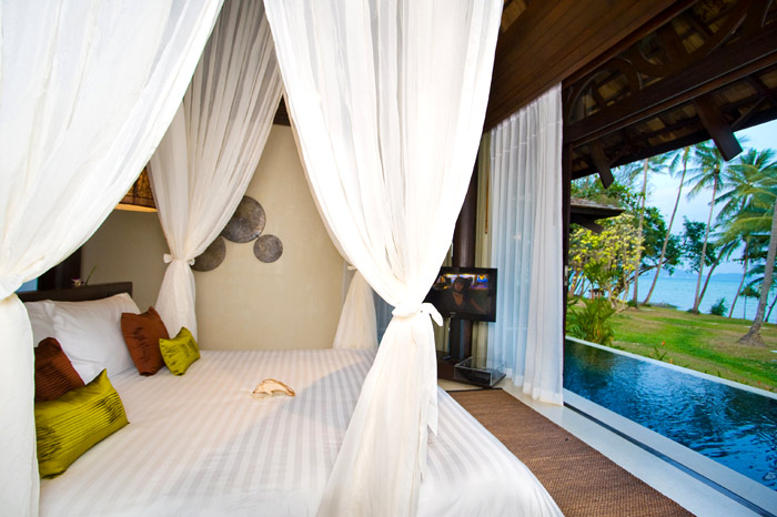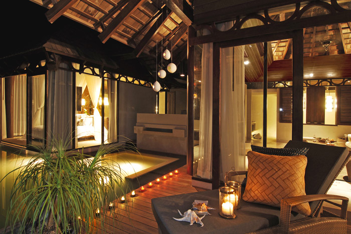 Вилла состоит из спальни, гостиной зоны, гардеробной, ванной комнаты с ванной и душем на открытом воздухе, террасы с шезлонгами и видом на море.