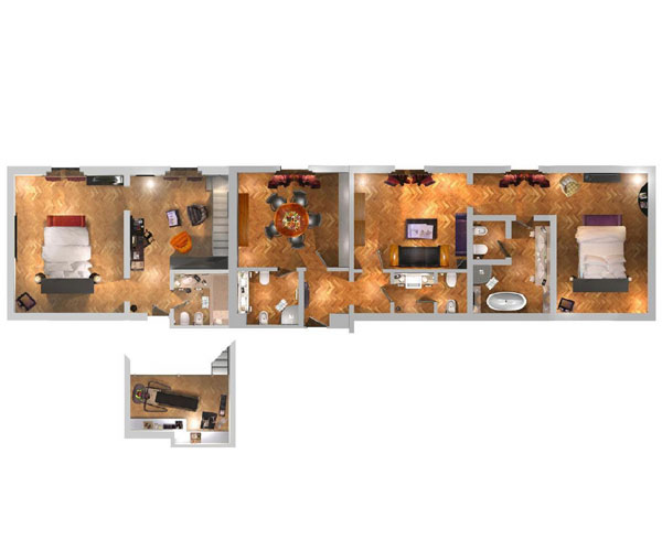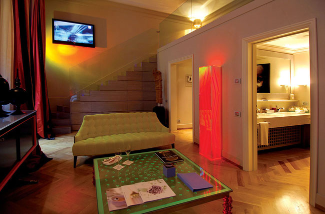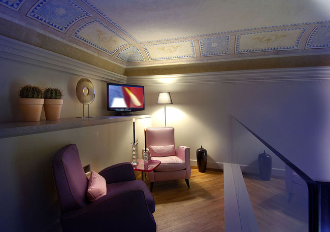 Verdi Suite (90 кв. м) - расположен на третьем этаже; с видом на галерею; состоит из спальни, гостиной, 2 ванных комнат с ванной и терапевтической душевой кабиной, гостевой уборной и столовой или большой гостиной на 16 гостей