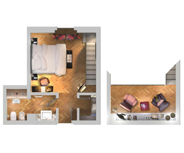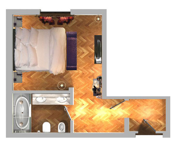 Courtyard Junior Suite (42 кв. м) - расположен на третьем этаже; с видом на внутренний дворик; состоит из спальни и 2 ванных комнат с душевыми кабинами