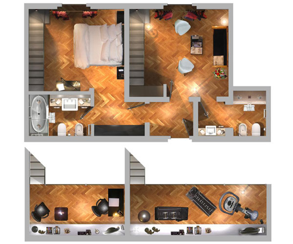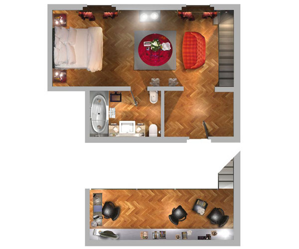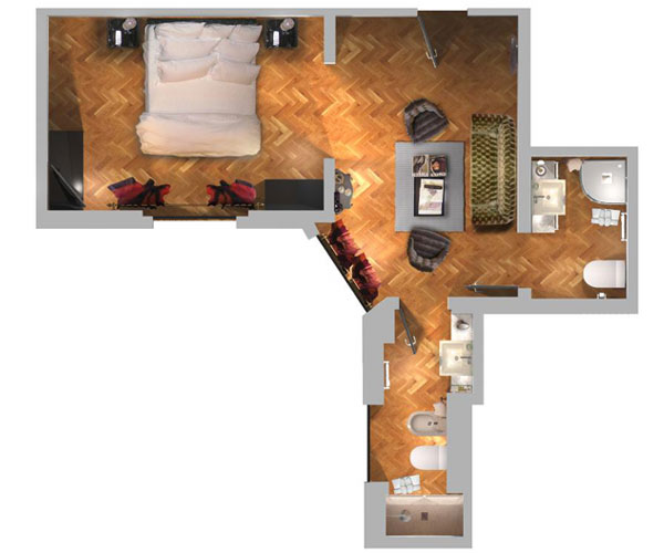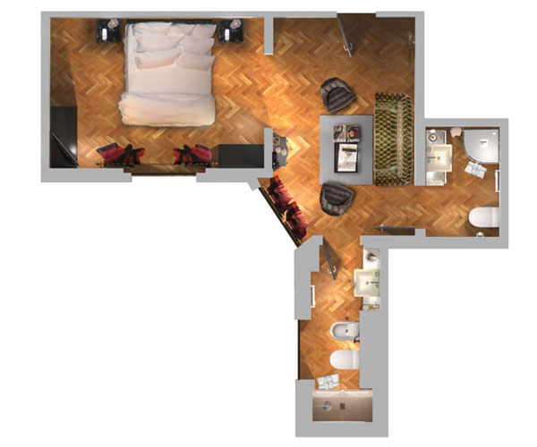 Rossini Executive Junior Suite (57 кв. м) - расположен на третьем этаже; с видом на галерею; состоит из спальни, гостиной, ванной комнаты с ванной и терапевтической душевой кабиной и зоны для отдыха