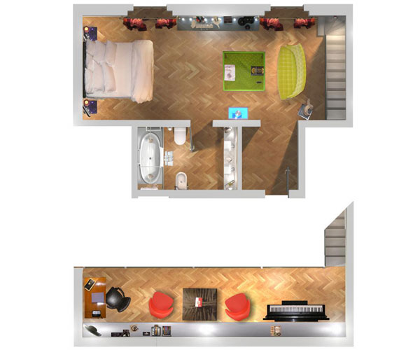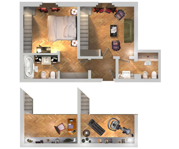 Toscanini Suite (63 кв. м) - расположен на третьем этаже; с видом на галерею; состоит из спальни, гостиной, ванной комнаты с ванной и терапевтической душевой кабиной и зоной для релаксации с велотренажером