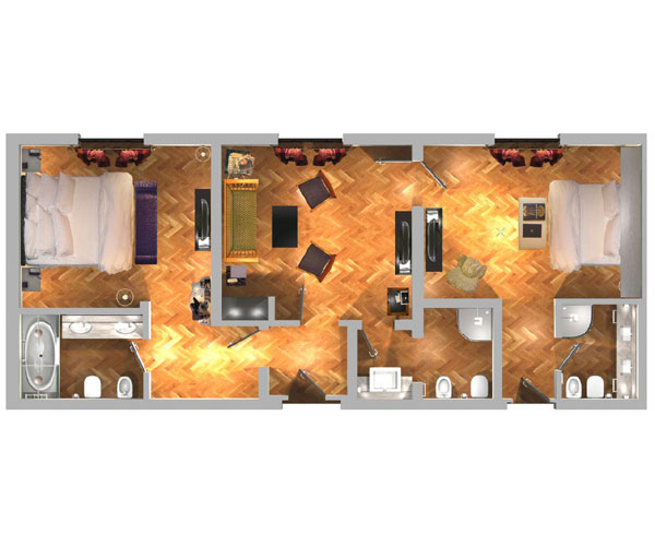 Two-Bedrooms Suite (81 кв. м) - расположен на четвертом этаже; с видом на галерею; состоит из 2 спален, гостиной, 2 ванных комнат с ванной и терапевтической душевой кабиной