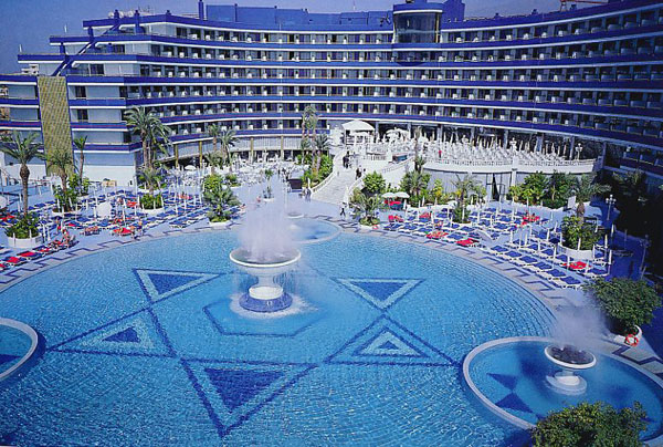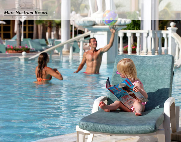 Средиземноморский Бассейн - это самый просторный бассейн отеля: впечатляющий бассейн на 1000 кв. м, с веселыми фонтанами в окружении обширного соляриума с лежаками. Находится в самом центре Mediterranean Palace, и располагает развлекательной террасой, где Вы можете выпить свежевыжатый сок или коктейль из нашей обширной карты, наслаждаясь живой музыкой.