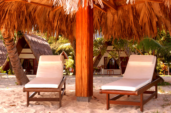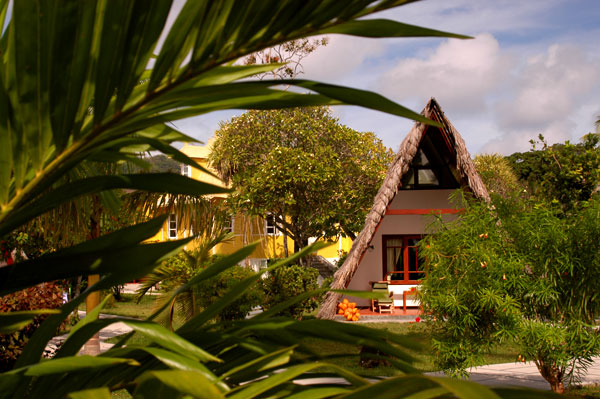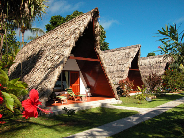 Все шале стилизованы под хижины с террасами, покрыты пальмовыми листьями и