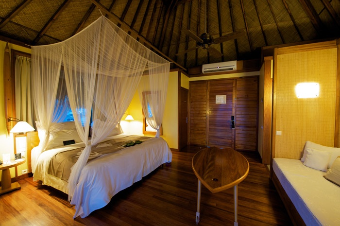 12 Overwater Bungalows (56 кв.м.) - бунгало на сваях в лагуне, состоят из спальни с двуспальной кроватью и диван-кроватью, гостиной, ванной комнаты с ванной и душем, террасы с зоной отдыха и спуском в воду.