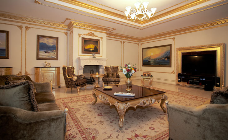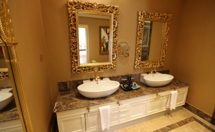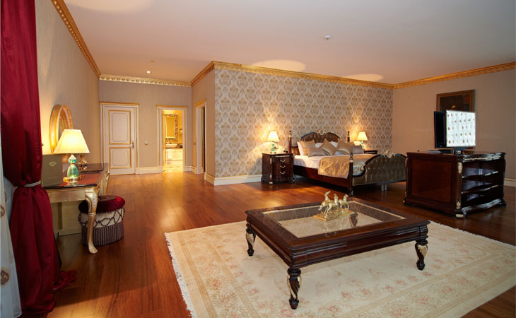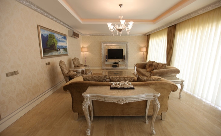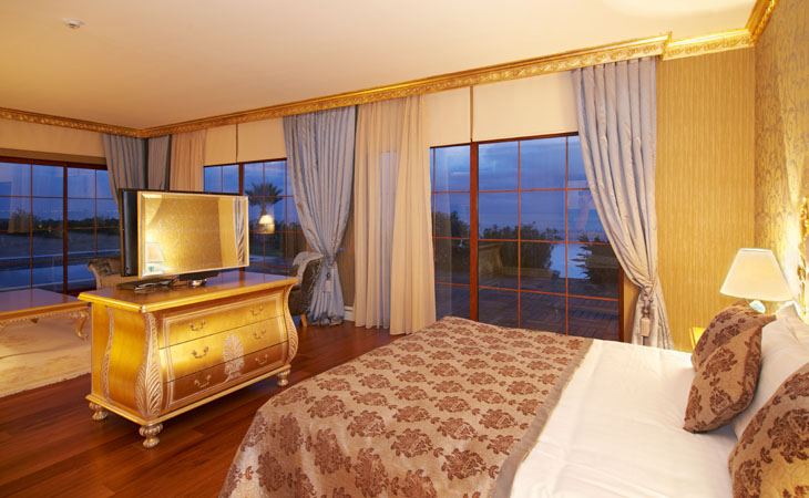 1 California presidental Villa: Уникальная одноэтажная вилла общей площадью 1100 кв.м.; прямо на берегу моря, с собственным открытым и закрытым бассейном, с собственным пляжем, с собственным садом 2500 м. Состоит из пяти спален и одной небольшой спальни (все с собственными ванными комнатами), с огромной общей гостиной. На вилле есть столовая, джакузи, рабочий кабинет, фитнес, турецкая баня, сауна, полностью оборудованная кухня.