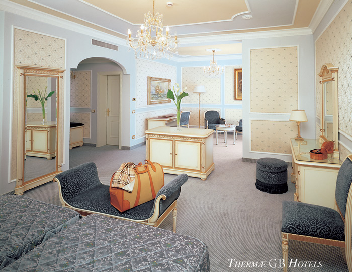 Imperial Suite (55 кв. м) - номера расположены на верхних этажах в центральном крыле отеля и имеют следующую планировку: при входе в номер по левую сторону расположена туалетная комната из натурального мрамора (туалет, биде, умывальник с большим зеркалом), просторная прихожая (TV со спутниковым телевидением, мини бар, столик и кресла, телефон), на полу ковровое покрытие, спальня с большой кроватью (пол, покрытый ковром) и телевизором, ванная комната из натурального мрамора с душевой кабинкой и ванной, биде, туалетом, двумя умывальниками с большим зеркалом, 2 балкона, окна которого выходят на пешеходную зону с завораживающим видом на Эуганские Холмы.