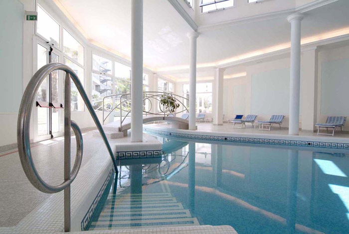 Бальнеотерапия в термальном бассейне - особый состав термальной воды в бассейнах отелей, и ее температура (от 30° до 35°С) обладают миорелаксантным действием и снимают мышечные контрактуры. В каждом отеле группы GB Thermae Hotels расположены бассейны с термальной водой разной температуры, как внутренние, так и соединенные с ними бассейны на открытом воздухе. Бассейны оборудованы гидромассажами, дорожками здоровья, водными тренажерами, водопадами, струйными дорожками против течения, зонами релакса. Бассейны идеально подходят для плавания, аквагимнастики, гидрокинезиотерапии. Ножные ванны Кнайп обладают тонизирующим действием и улучшают кровообращение, что делает их эффективными в лечении проблем, связанных с венозной недостаточностью. Купание в термальном бассейне рекомендуется также для психофизического восстановления спортсменов.