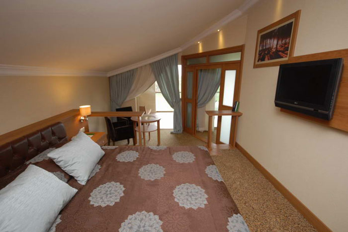 Suite Room (55-60 кв. м) – двухкомнатные номера. Состоят из гостиной с мягкой мебелью, спальни с дверью, ванной комнаты с ванной. Макс. 3+1 человек.