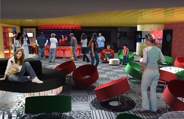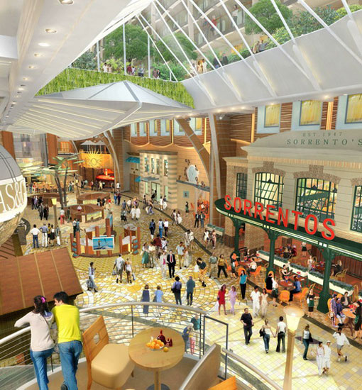 На лайнере будет построен Королевский променад высотой в 19 метром, на 2вух первых этажах которого расположатся многочисленные кафе и бары, а на третьем разместятся каюты для гостей. Здесь будет работать фантастический Rising Tide – бар, который словно лифт, будет курсировать на три палубы вверх, между променадом и центральным парком. Утром над Променадом витают ароматы кофе и свежей выпечки, днем здесь можно пообедать в ресторанчиках и пиццериях, а вечерами гостей будут ждать ярчайшие парады, представления и развлечения!