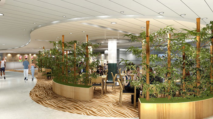 Красочная прогулочная палуба со множеством альтернативных кафе и ресторанов, настоящей французской каруселью, на которой расположен детский клуб и зона развлечений для тинейджеров.