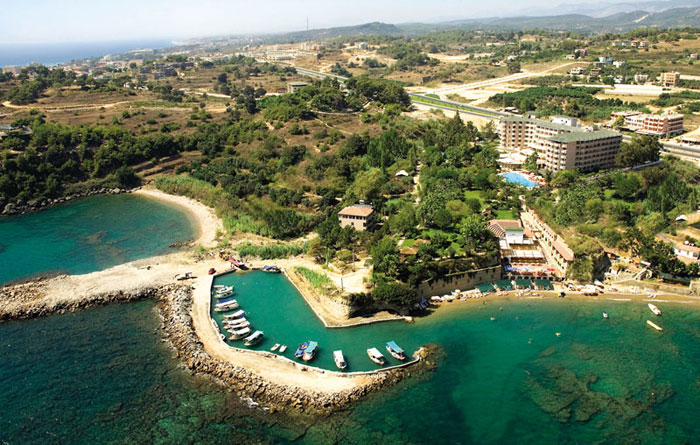 в 88 км от аэропорта г. Анталья, в 33 км от г. Аланья, в 5 км от поселка Авсаллар, на самом берегу моря.