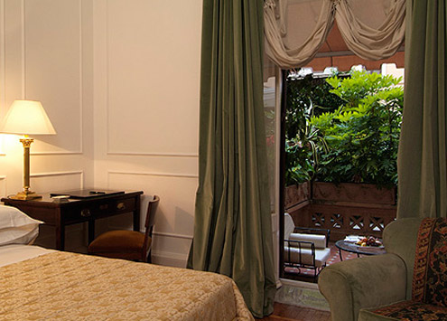 Все номера отеля просторные, с высокими потолками. В каждом имеется большая мраморная ванная комната, жалюзи на окнах, самое современное оборудование (как, например, индивидуальная система контроля микроклимата и спутниковое телевидение), а также роскошные туалетные принадлежности. Номера украшены картинами и фотографиями с изображением Рима. Паркетные полы покрыты персидскими коврами. Покрывала и шторы изготовлены только из самых изысканных итальянских тканей.
