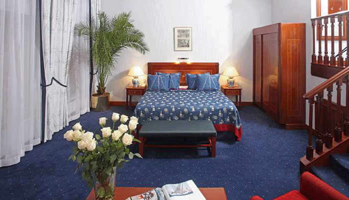 Deluxe Moika Suite - атмосфера номера идеально сочетается с видом из окна благодаря морскому декору в голубых тонах и стилизованной мебели. Масляные портреты на стенах придают номеру особое настроение. А большой письменный стол позволит расположить компьютер, разложить бумаги и поработать.