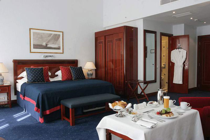 Moika River Executive Suite - из окон президентских апартаментов открывается изумительный вид на одно из самых знаменитых мест Петербурга, визитную карточку города, которую узнают во всем мире, – Дворцовую площадь и Государственный музей Эрмитаж (в прошлом Зимний дворец). Каждый камень здесь хранит множество славных историй. К тому же это потрясающе красивый уголок северной столицы. А летом с балкона, украшенного прелестными цветами, можно подолгу любоваться корабликами, проплывающими под Певчевским мостом по реке Мойке. Интерьеры апартаментов, выдержанные в идеальных пропорциях и обставленные превосходной классической мебелью, по-королевски роскошны. Потолки здесь на два метра выше, чем в остальных номерах отеля. А просторные гостиная и спальня богато украшены антикварными вещами, являющимися настоящими произведениями искусства. Орнамент на стенах и ковры относятся к царским временам, картины датируются серединой 19 века. Ванная комната, с большой ванной, душевой кабиной и двойным умывальником, отделана зеленым и белым мрамором. Все предусмотрено для полного комфорта: теплые полы, банные халаты, много полотенец, косметика Bulgari. А в качестве приветственного комплимента от отеля здесь всегда живые орхидеи. Имеется множество деталей, создающих удобную и уютную атмосферу: великолепные подушки одеяла из гусиного пуха, мини-бар, два жидкокристаллических телевизора с интерактивными услугами, высокоскоростной Интернет и телефонная линия, круглосуточное обслуживание номеров и гостевой туалет.