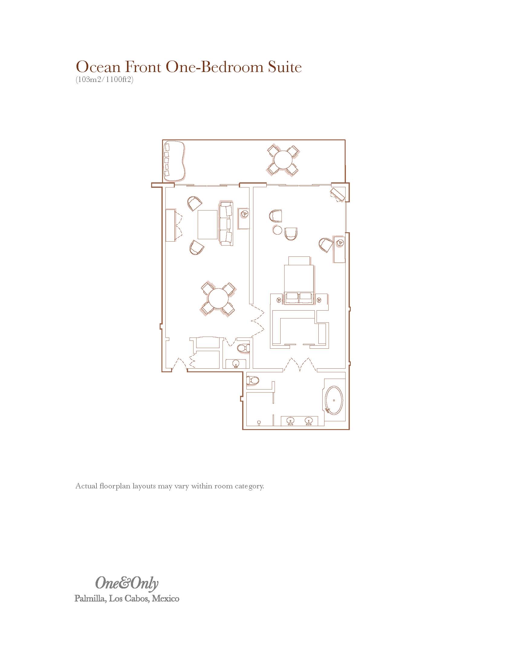 • Ocean Front One Bedroom Suite (103 кв. м) — с видом на океан, состоят из спальни (кровать King-size) с гостиной зоной, ванной комнаты, отделанной мрамором с душем и ванной. Стеклянные раздвижные двери, которые ведут во внутренний дворик или балкон с диванами для отдыха.