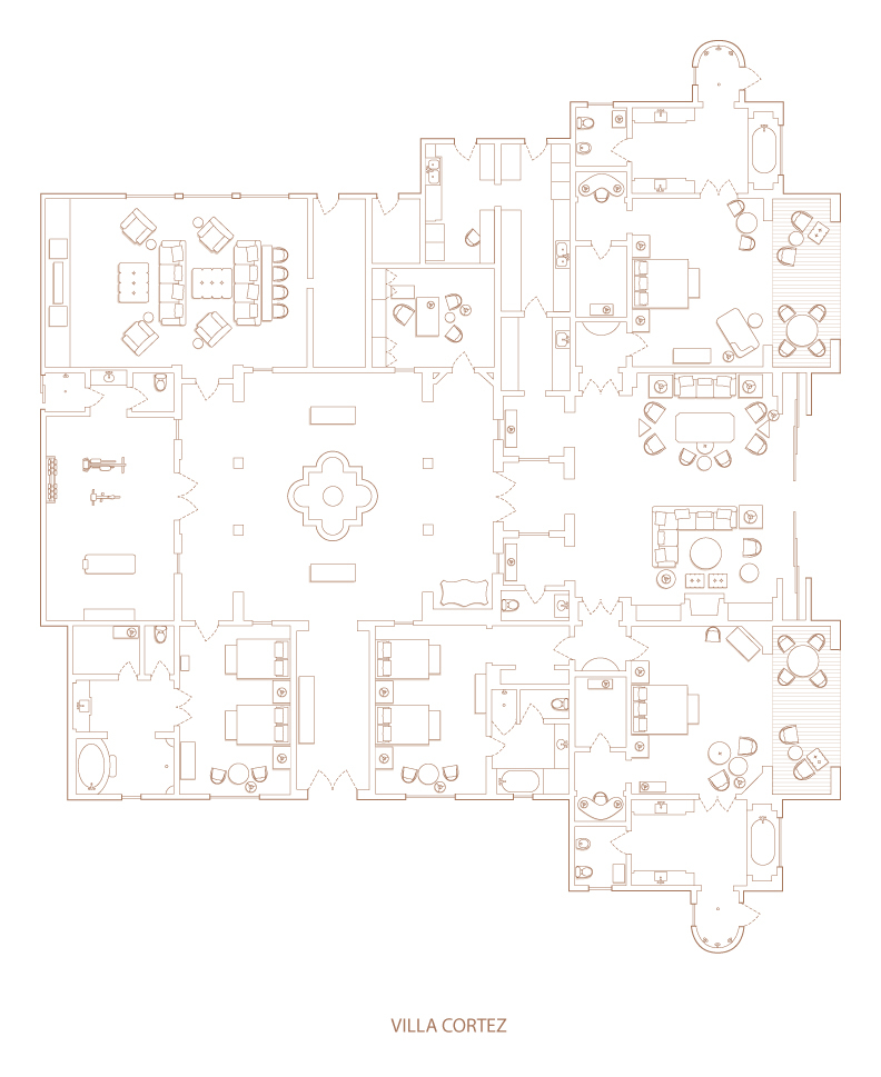 • Villa Cortez (976 кв. м) - из них 790 кв. м - жилой площади и 186 - нежилой. Состоит из четырех спален, оборудованного кухонного уголка, ванной комнаты, отделанной мрамором с душем и ванной, гардеробной, бассейна с джакузи, Spa-услуги. В дополнительные услуги входит: обслуживание дворецкого (24 часа в сутки), личный шеф-повар.
