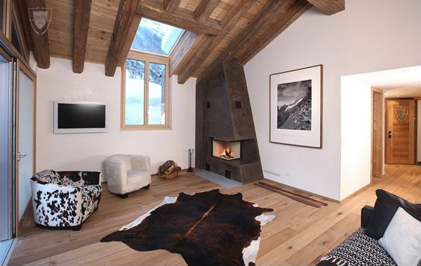 Чрезвычайно большая гостиная комната с открытым камином, четыре отдельные спальни, три ванные комнаты и полностью оборудованная роскошная дизайнерская кухня. Все ванные оборудованы масажным душем, раковиной и туалетом, основная ванная комната дополнительно оборудована ванной. Огромный балкон на южной стороне имеет захватывающий вид на Маттерхорн.