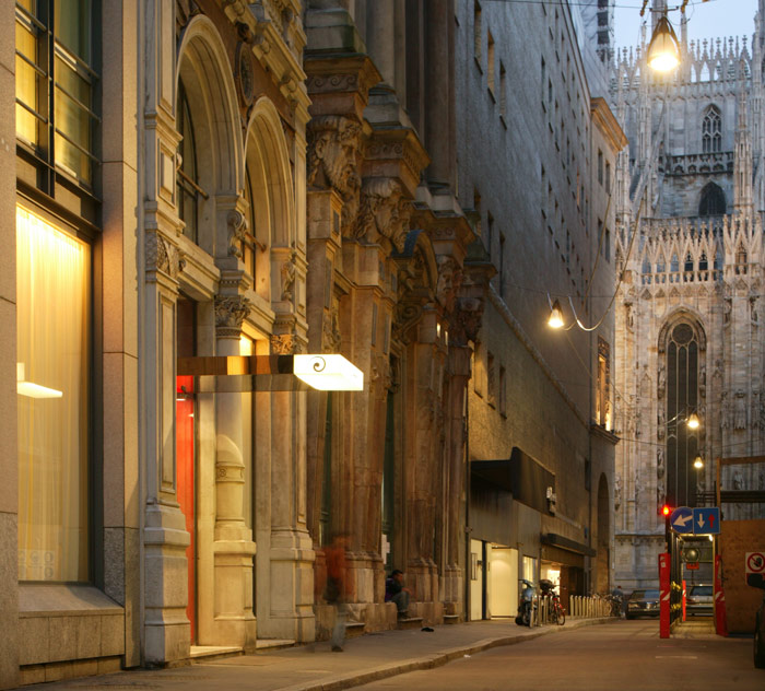 в центре Милана, напротив галереи Витторио Эммануэле (Vittorio Emanuele), между Домским собором и оперой "Ла Скала". В 15 километрах от международного аэропорта Линате, в 45 километрах от международного аэропорта Мальпенса), в 2 км от центрального ж/д вокзала Милана.