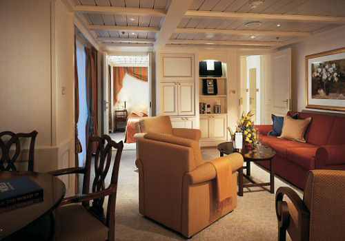 Owner’s Suite (77 кв. м + веранда 8 кв. м) – cостоит из ванной комнаты с джакузи, гардеробной, дамской комнаты, гостиной залы с обеденном столом, отделанной тиком, необычайно просторной веранды с застекленными дверями. Расположен в центральной части лайнера на 7-й палубе. Возможен заказ Owner’s Suite с двумя спальнями, в таком случае предусмотрено использование гостями Vista Suite, который объединяется с Owner’s Suite