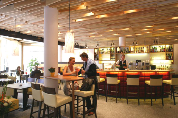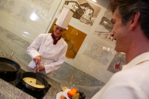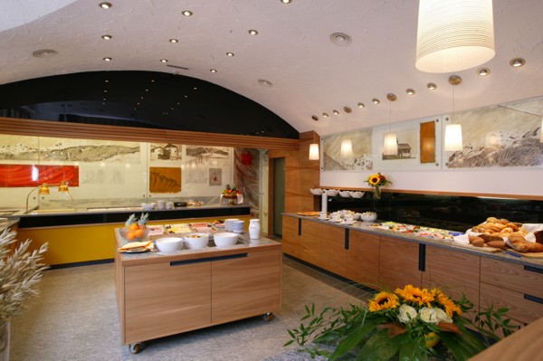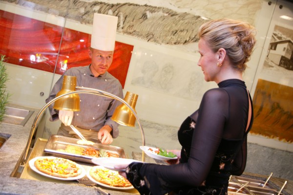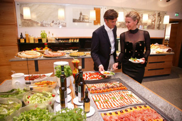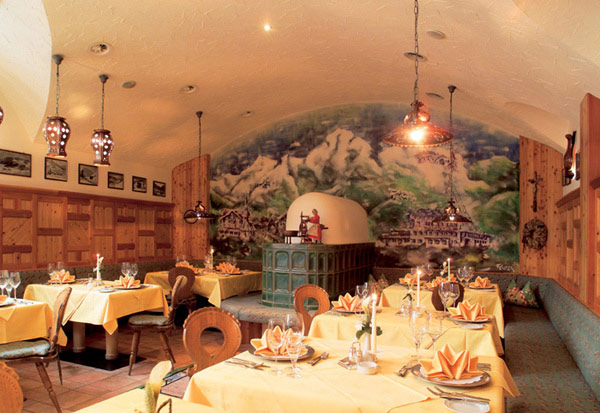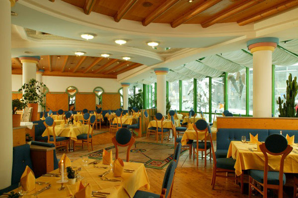• В элегантном, отделанном деревом, ресторане отеля предлагается разнообразие блюд местной и интернациональной кухонь, представленное на шведском столе: богатые буфеты завтраков, салатов, закусок, выпечки, сыров, каждую неделю — фермерские буфеты, буфеты австрийской и итальянской кухонь, вечером предложены меню ужинов из трех блюд, устраиваются гала-ужины при свечах. Также предусмотрено вегетарианское меню.
