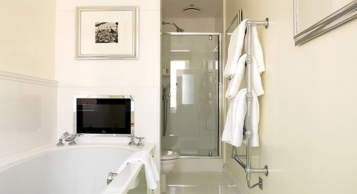 в ванной комнате – ванна, душ, фен, телевизор, халаты