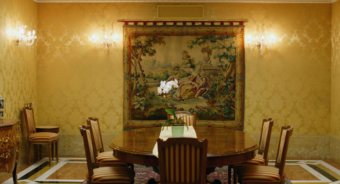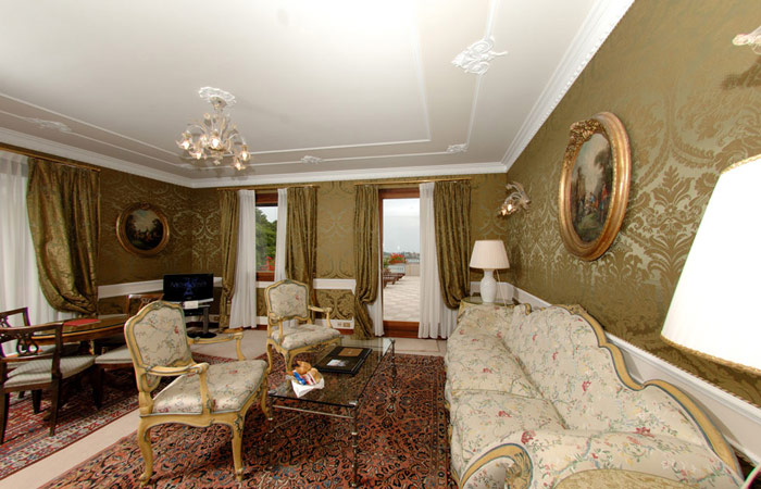 1 Presidential Suite "Giorgione" (70 кв. м) - двухуровневый номер на самом верхнем этаже, украшенный гобеленами восемнадцатого века. На первом уровне располагается элегантная гостиная, с изысканными предметами интерьера; на втором красивая спальня с двумя ванными комнатами, каждая с джакузи; гардеробная, просторная терраса с захватывающим видом на на Венецию и на лагуну.