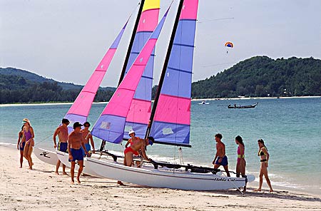 | Ездил на Пхукет второй раз, но теперь решил в ноябре, в прошлом году был весной. Отдыхал две недели, брать отдых меньше десяти дней считаю нецелесообразным. Перед заказом тура собрал рекомендации коллег, в нашем банке Таиланд чрезвычайно популярен. Тендер справедливо выиграл пятизвездочный отель Laguna Beach Resort. Летел, как и в прошлый раз, через Бангкок, однозначно впечатляющий мегаполис. В следующий раз думаю отвести на его осмотр дня четыре. Про отель. Большой, солидный, в традиционной для азиатов архитектуре, острые крыши, переходы, террасы и прочее, ну как они любят. Территория, как у президентского гольф-клуба, травка деревья и прочее, все растет, цветет и все ухожено. Тайцы как муравьи, туда-сюда, каждый при деле, каждый вкалывает, упившихся под забором не наблюдал. Хотя могли конечно бамбук курить, при таком климате само все из земли должно переть. Номера просторные, для одного меня так даже великоват, все ж за сорок метров. Хотя с другой стороны, при таком банном климате снаружи, внутри от большой площади вроде как создается ощущение дополнительной прохлады. Оборудование тоже пятерочное, все не коцанное, все работало, и кондей и сантехника с электрикой. Порадовало, что въезжающему в номер предоставляют всякую полезную мелочевку от разной душевой косметики до кофе, не надо тащить как суслику это из Москвы или бегать потея по местным сельпо. Про персонал писать не буду, кто был, тот знает, как тайцы по услужливости отличаются от туреков или полусонных доминиканцев. В отеле только завтракал. Выбор был и для диетиков, и для тех, кто как я любит с утра плотно зарядится. Обед и тем более ужин проводил в многочисленных ре6сторанчиках неподалеку или на тачке отправлялся в Патонг, там выбор побольше и по меню и по бабкам. Днем лапшичка с морскими гадами или курицей, а вечером крабики-креветки да под кокосовый супчик, да с пивком. Лидерами в моем животе стали конечно Чамп и Тигр. Да, конечно, это не "кельш" или пражский "вельвет", но вполне достойные напитки, хотя по всему разбираться в пивоварении буддистам вроде как не положено. В общем праздник приятного аппетита длился от прилета до отлета. Из развлечений, конечно, прежде остального – это море и все, что с ним связано. Не хуже купаловка была только на Кубе, но там сервис профкомовский. Дней восемь отдано пляжному балдению. Кроме того, съездил на рыбалку в компании с двумя соотечественниками из Мытищ, почти земляки. Не сказать, чтоб я отличился великим уловом, общий вес был взят на уровне шести кило, но очень прикольно. По впечатлениям поярче, чем на базе под Астраханью. Катался на слонах, в прошлый раз сильно тяжеловозы эти понравились. На рафтинге в одном месте сверзился в воду, если б не шлемак, башню б побил. Что-то видать расслабился не вовремя, но обошлось. Резюмируя, скажу, что в этой стране мне нравится, что турист, оставляя здесь бабло, чувствует себя желанным гостем. Реальная расслабуха, если не париться над медузкой в воде или комариком на пальме. Этот отель себе поставил на заметку, если поеду опять на Пхукет, хотя тянет посетить еще не потоптанные москвичами места, то однозначно остановлюсь на нем, уже проверенном. ЗЫ. Кстати, тут почитал отзывы народа, народ типа гневается, что рядом с пляжем находятся торговые палатки и что им приходится на фоне их фотографироваться. Реально, товарищи, надо 